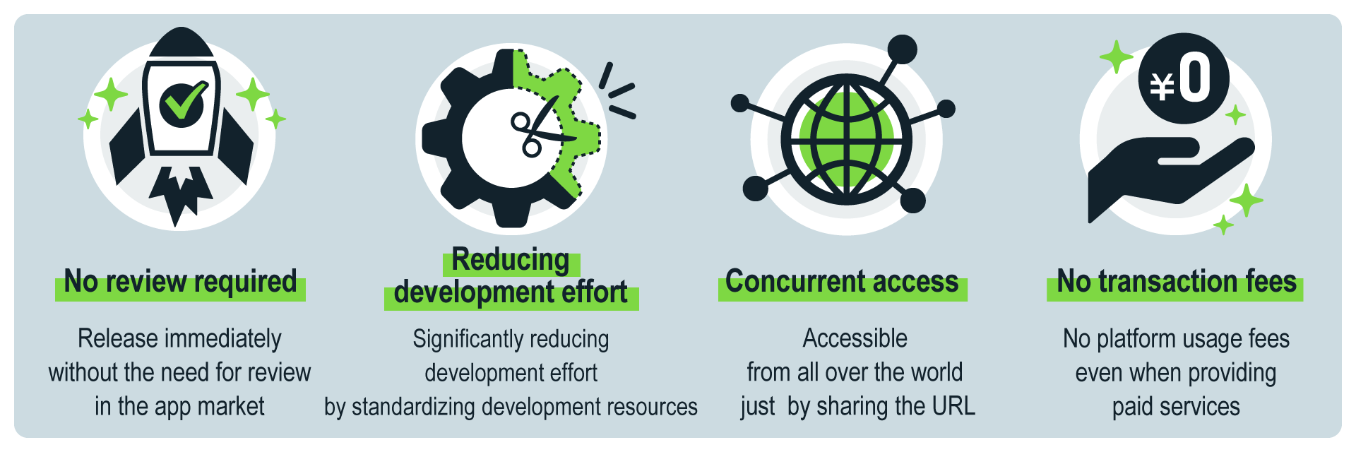 WEBmetaverse offers its services through browsers, eliminating the need for app market applications and reviews. Normally, each app market has its own set of review standards, requiring specific adjustments, which can increase development time and man-hour. With our solution, the same program operates across platforms, allowing us to successfully reduce development efforts by more than half. Additionally, as long as there is a standard network environment, it can be accessed from anywhere in the world.